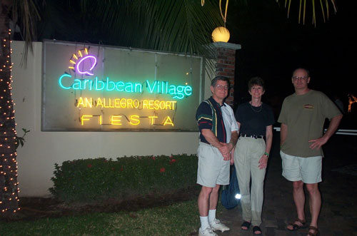 | All inclusive with good food, but noisy resort with unswimmable beach. (Photo: Jerry with traveling companions Dave and Dot Milsom.) |