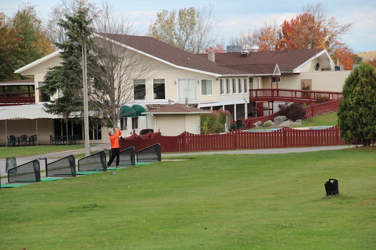 | Only hotel available in the Buffalo area. Pleasant setting, but a bit shabby. (Jimmy hitting a bucket of balls in photo) |