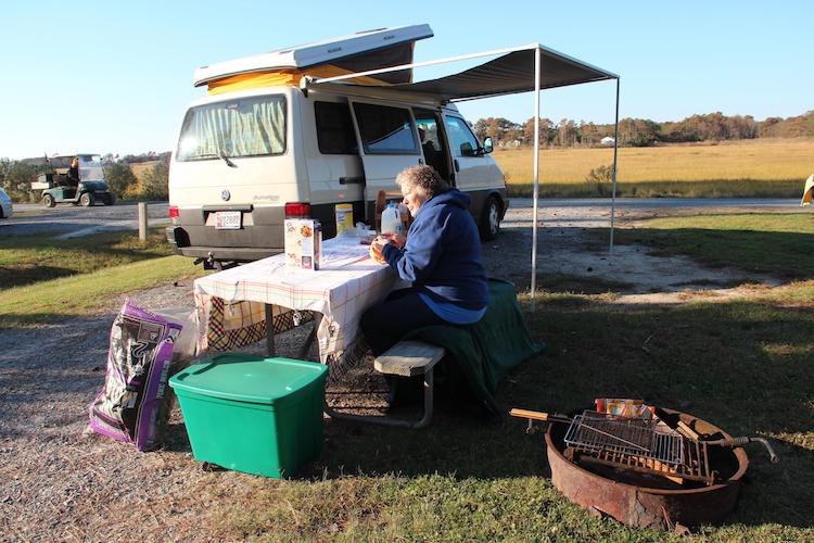 | First use of our VW camper. Got a nice spot overlooking the marsh, but the weekend was unseasonably cold. Went with a group of Jess's friends for a Halloween event. |