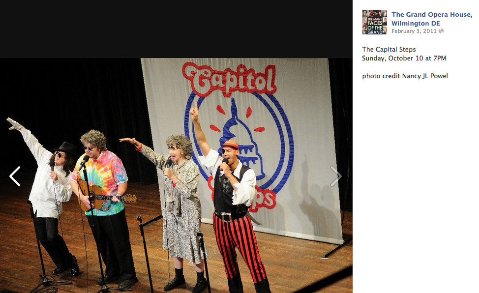 Musical political humor. Having only heard them on the radio, I wasn't prepared for the very funny stage antics - few props, but frequent costume changes. Several Delaware jokes courtesy of Christine O'Donnell and Joe Biden, plus this skit:
