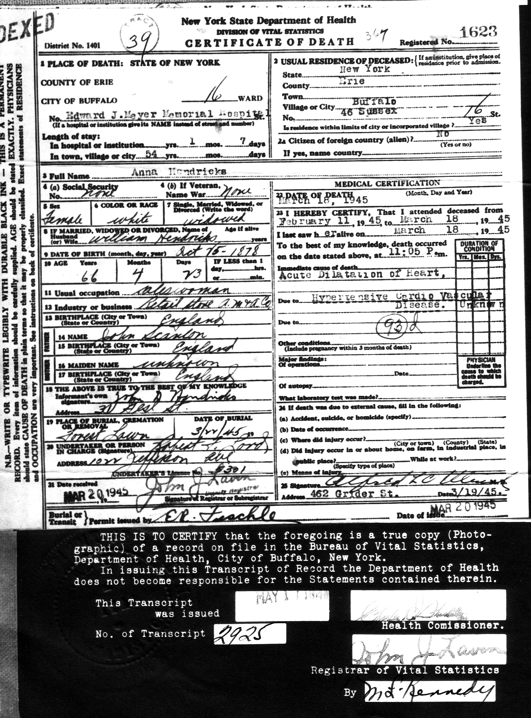 51. “Anna Hendricks Cerificate of Death,” 18 Mar 1945, Buffalo, Erie, New York, 2925, 1623, Photocopy.