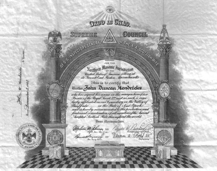 56. “ John Hendricks Northern Masonic Jurisdiction Certification,” 3 Dec 1943, Buffalo, Erie, New York, Original document.