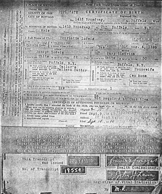 57. “Henrietta Ludwig Certificate of Birth,” 9 Sep 1940, Buffalo, Erie, New York.