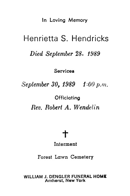 58. “Henrietta Hendricks Memorial Card,” 30 Sep 1989, Amherst, Erie, New York, Original.
