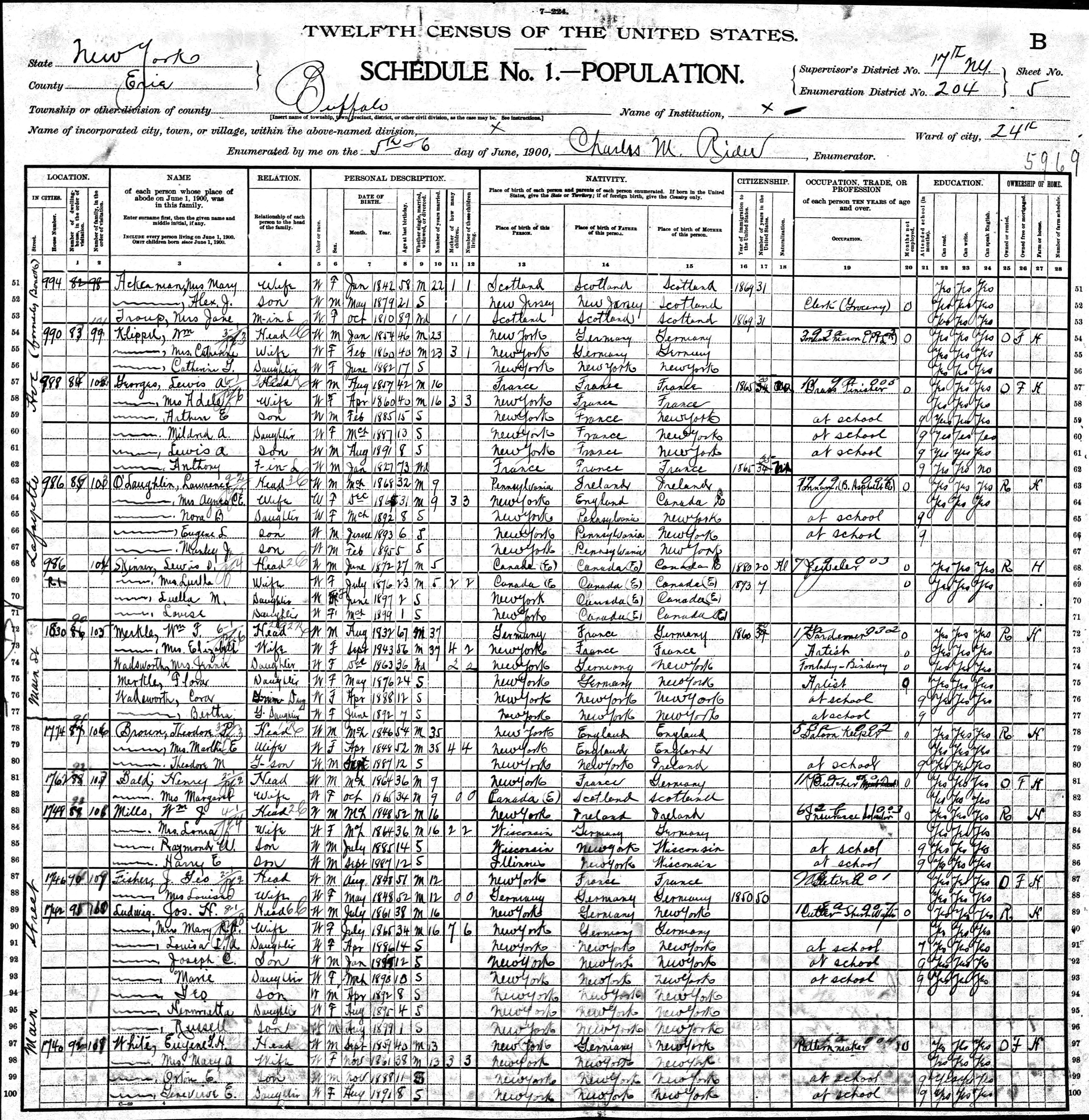 59. “1900 Buffalo Ward 24, Erie, New York; Roll T623_1032; Page- 5B; Enumeration District- 204,” 5 Jun 1900.