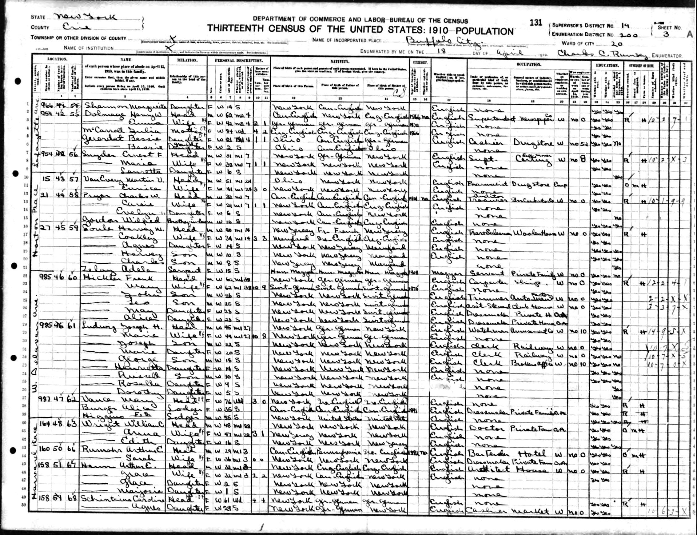 60. “1910 Buffalo Ward 20, Erie, New York; Roll T624_947; Page- 3A; Enumeration District- 200; Image- 265,” 18 Apr 1910.