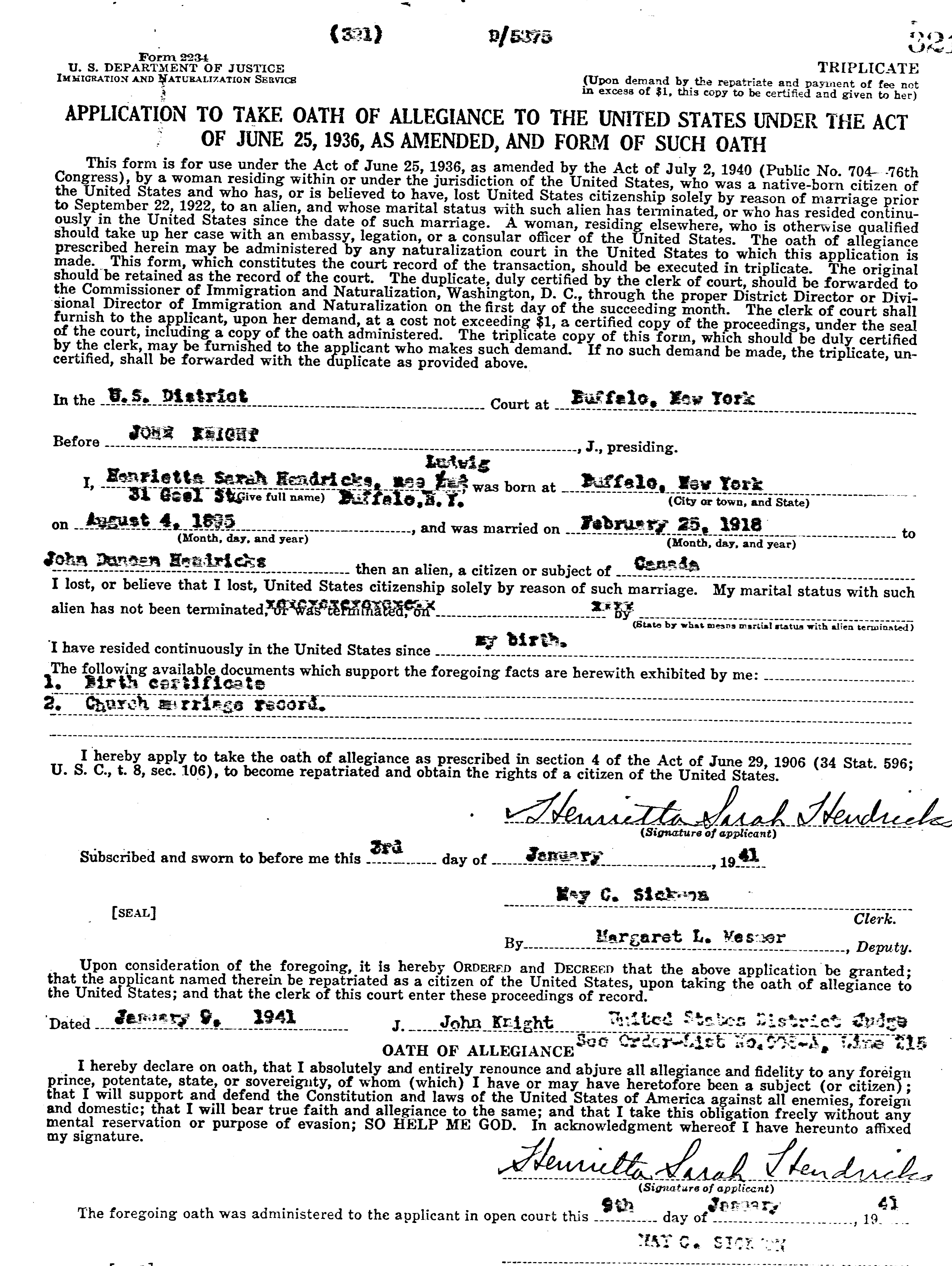 61. “Henrietts Hendricks Oath of Allegiance to the US,” 9,Jan 1941, Buffalo, Erie, New York, Scanned document.
