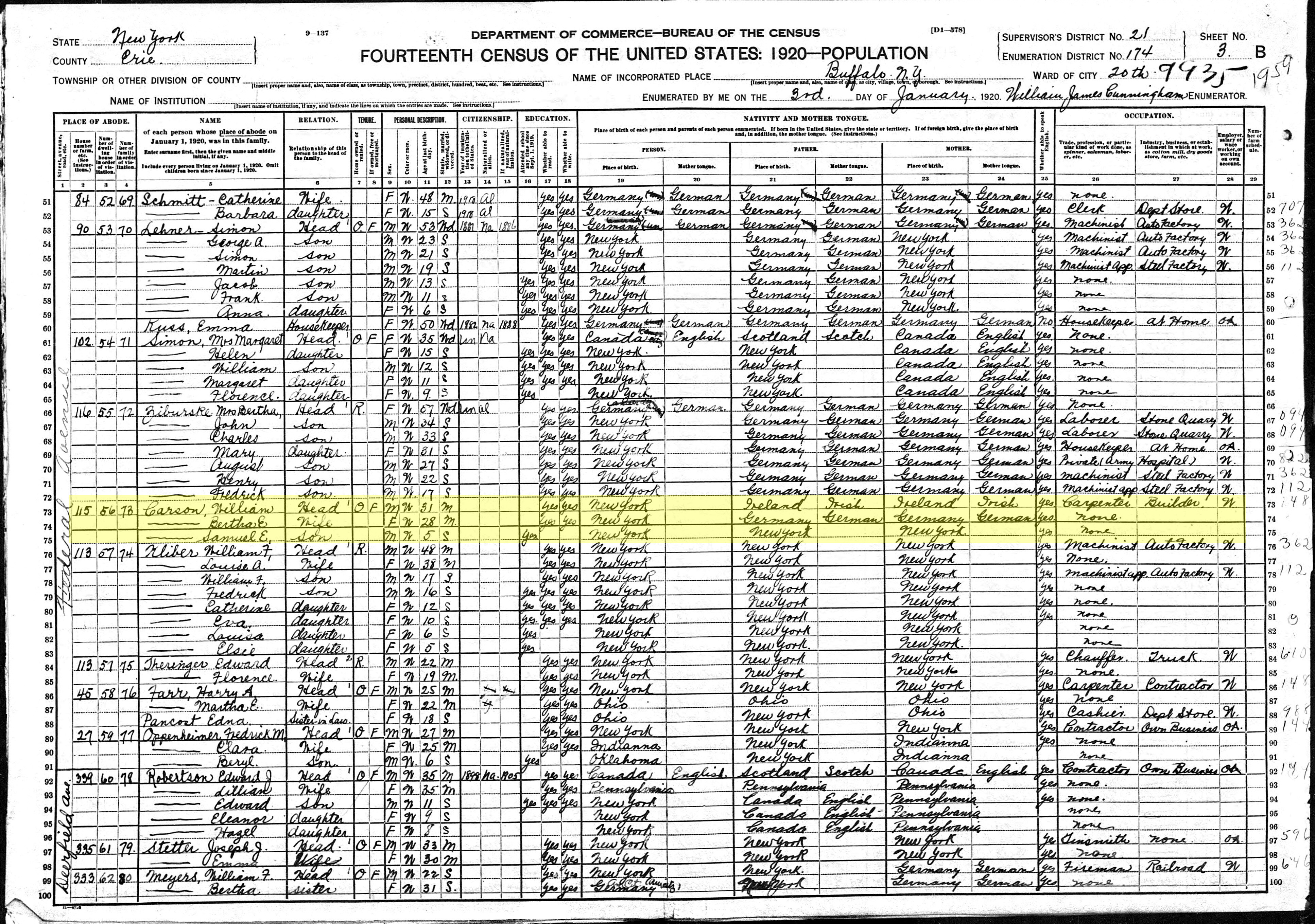 File: 1920 Buffalo Ward 20, Erie, New York; Roll T625_1104; Page- 3B; Enumeration District- 174; Image- 1036Yel