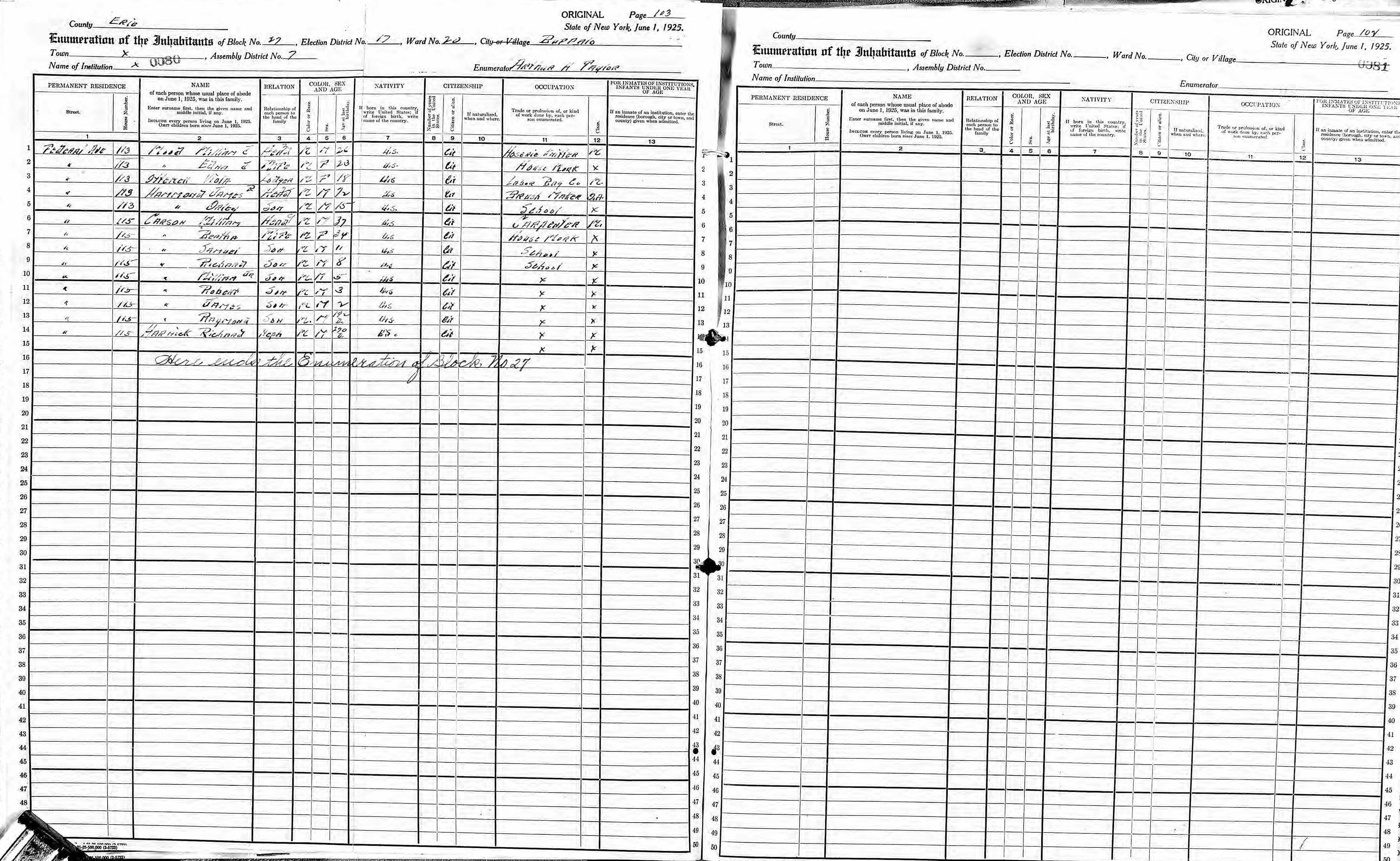 File: 1925 New York, Election District- 17; Assembly District- 07; City- Buffalo Ward 20; County- Erie; Page- 103