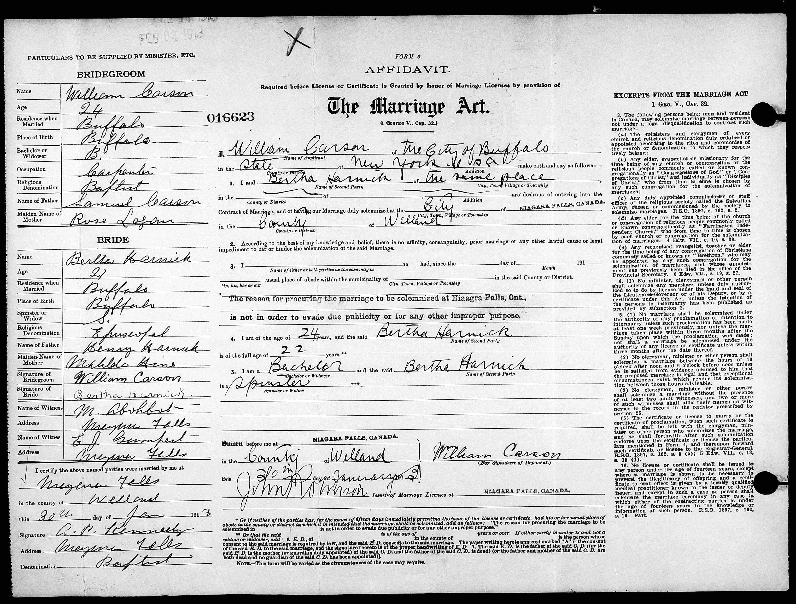 73. “William and Bertha Carson Marriage Affidavit,” 30 Jan 1913, Niagara Falls, Ontario, Canada, 016623.