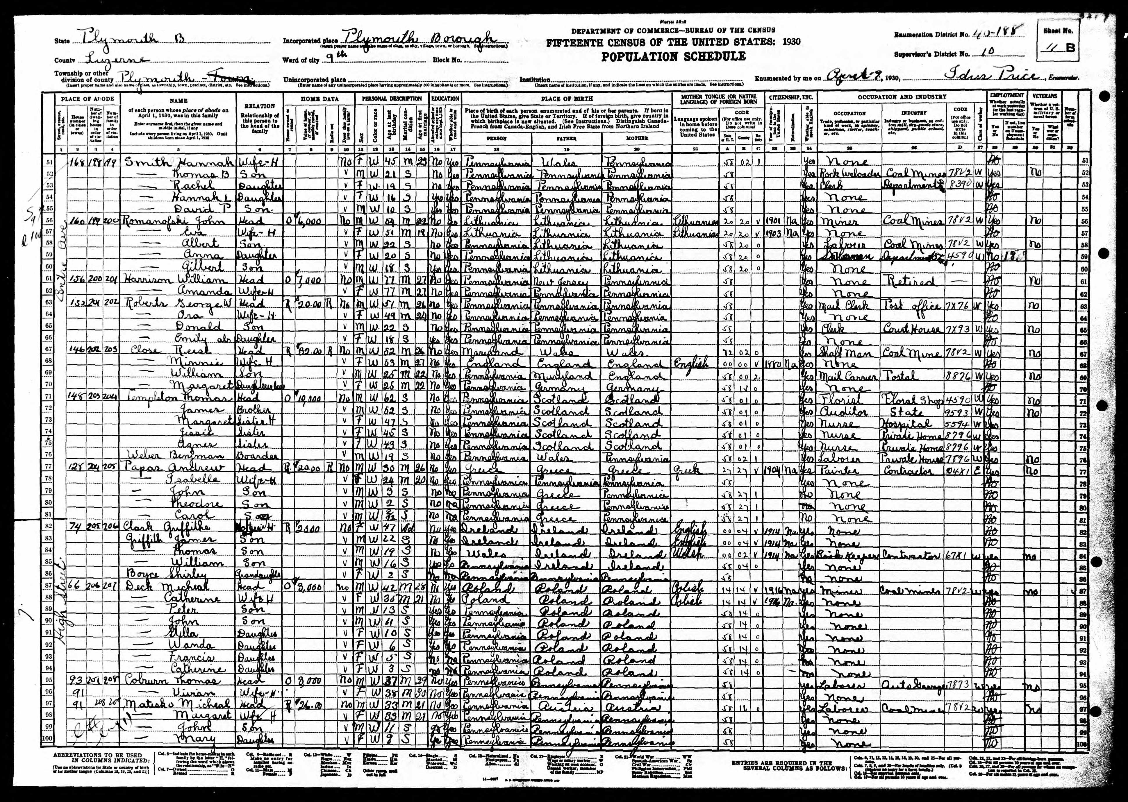 130. “1930 Plymouth, Luzerne, Pennsylvania; Page- 11B; Enumeration District- 0188; FHL microfilm- 2341803,” 9 Apr 1930.