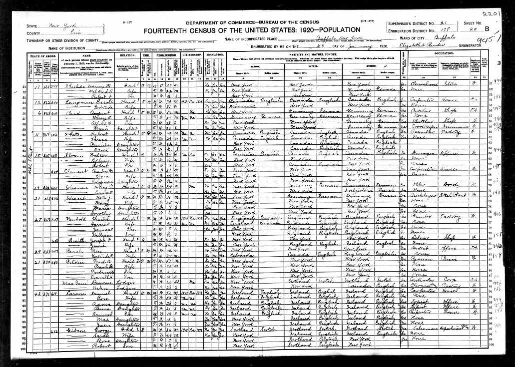 File: 1920 Buffalo Ward 20, Erie, New York; Roll- T625_1105; Page- 20B; Enumeration District- 178; Image- 153