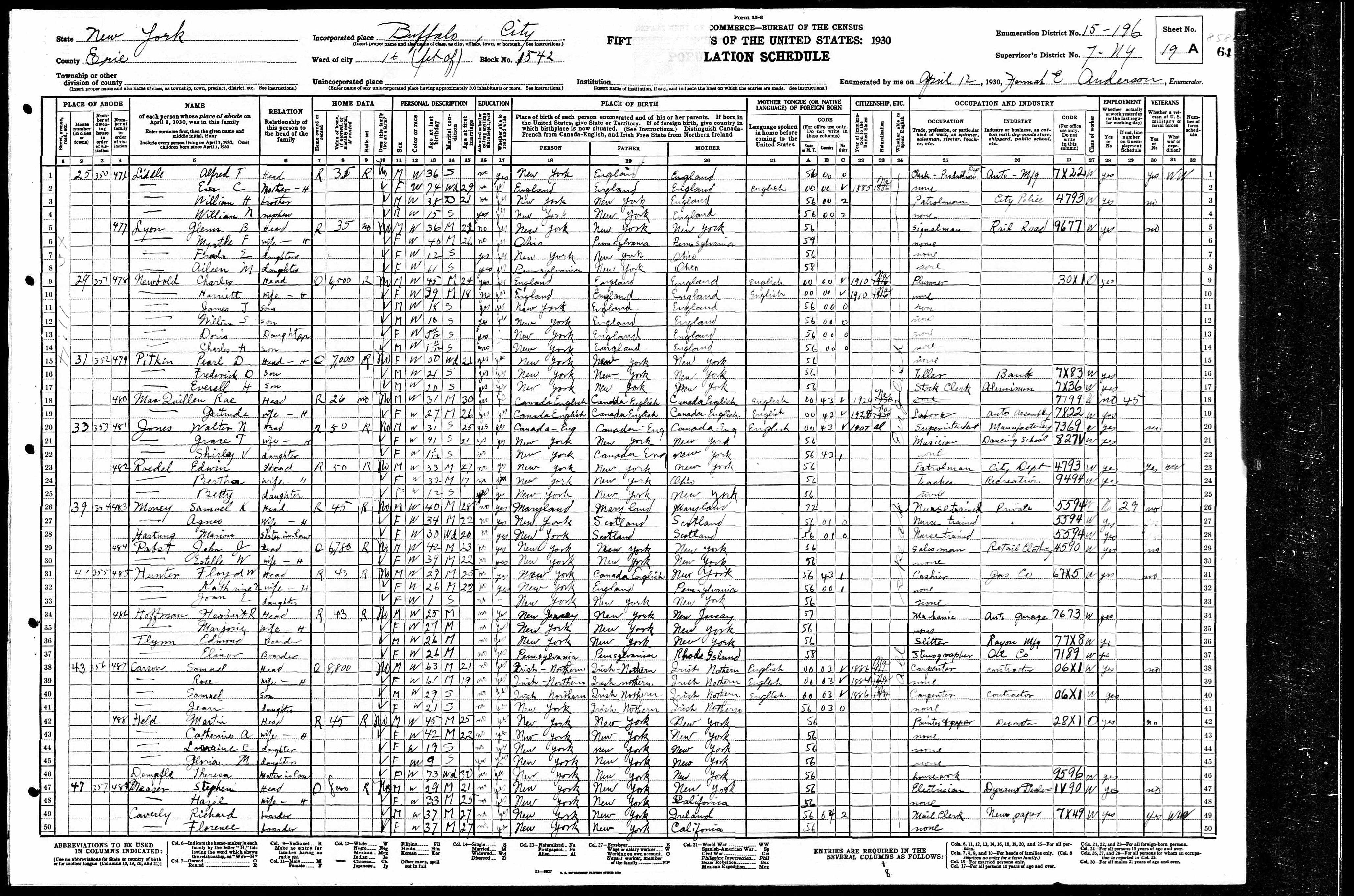 File: 1930 Buffalo, Erie, New York; Roll- 1429; Page- 19A; Enumeration District- 196; Image- 129.0; FHL microfilm- 2341164