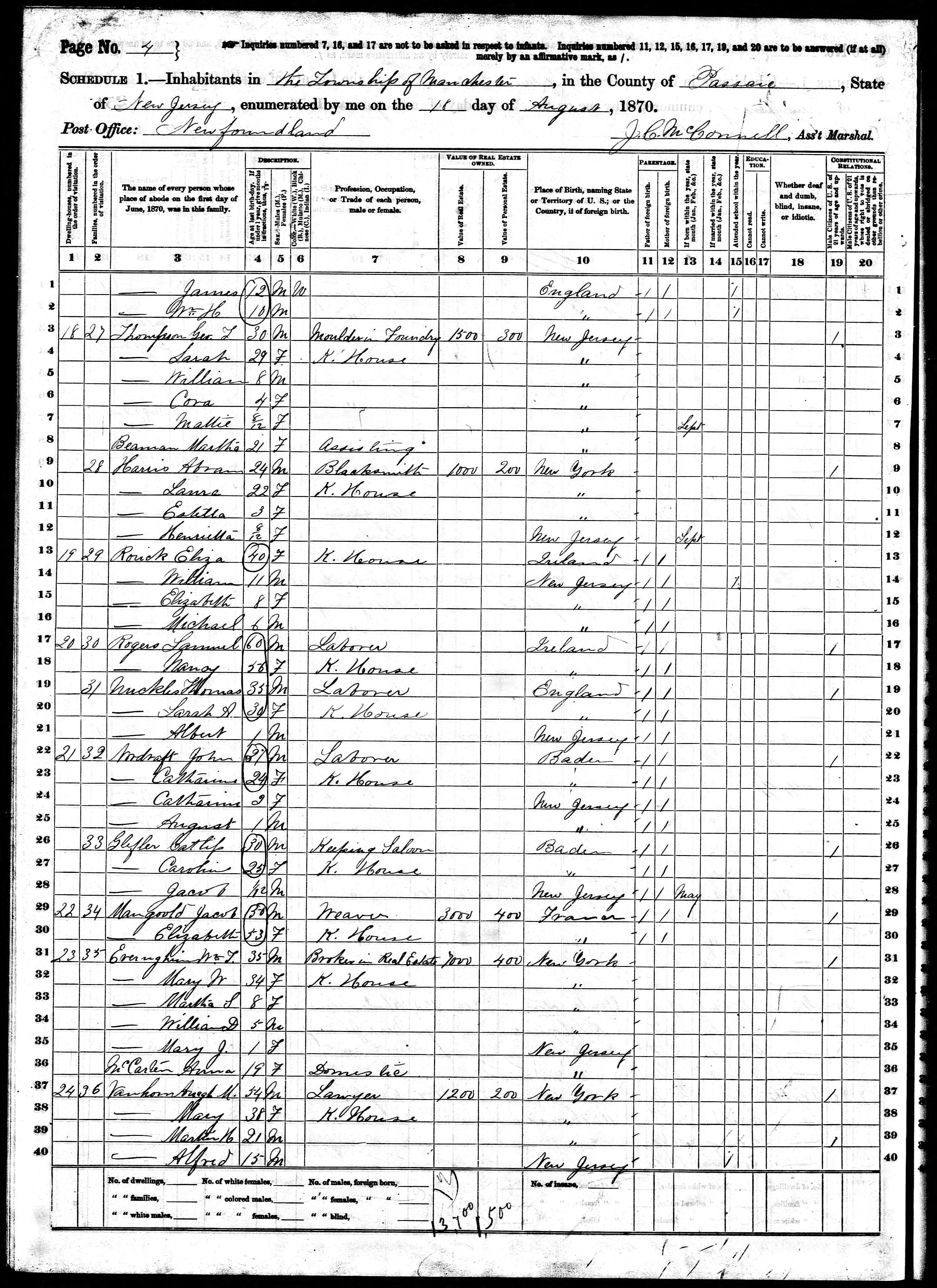 File: 1870 Manchester, Passaic, New Jersey; Roll M593_884; Page- 4; Image- 155; Family History Library Film- 552383