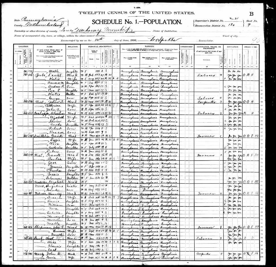 282. “1900 Lower Mahanoy, Northumberland, Pennsylvania; Roll- 1449; Page- 9B; Enumeration District- 0130; FHL microfilm- 1241449,” Lower Mahanoy, Northumberland, Pennsylvania, 14 Jun 1900.