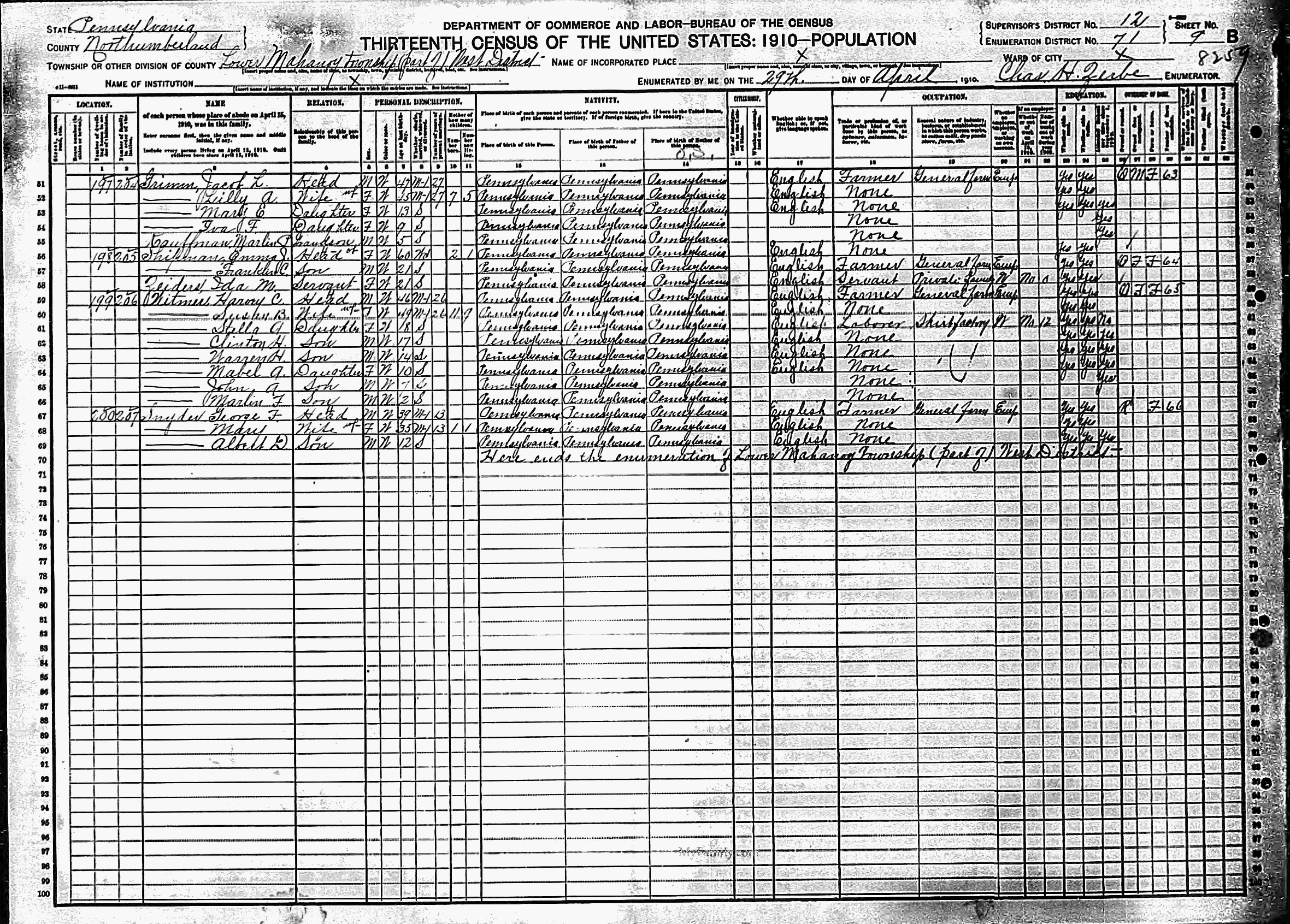 File: 1910 Little Mahanoy, Northumberland, Pennsylvania; Roll T624_1384; Page- 9B; Enumeration District- 71; Image- 99