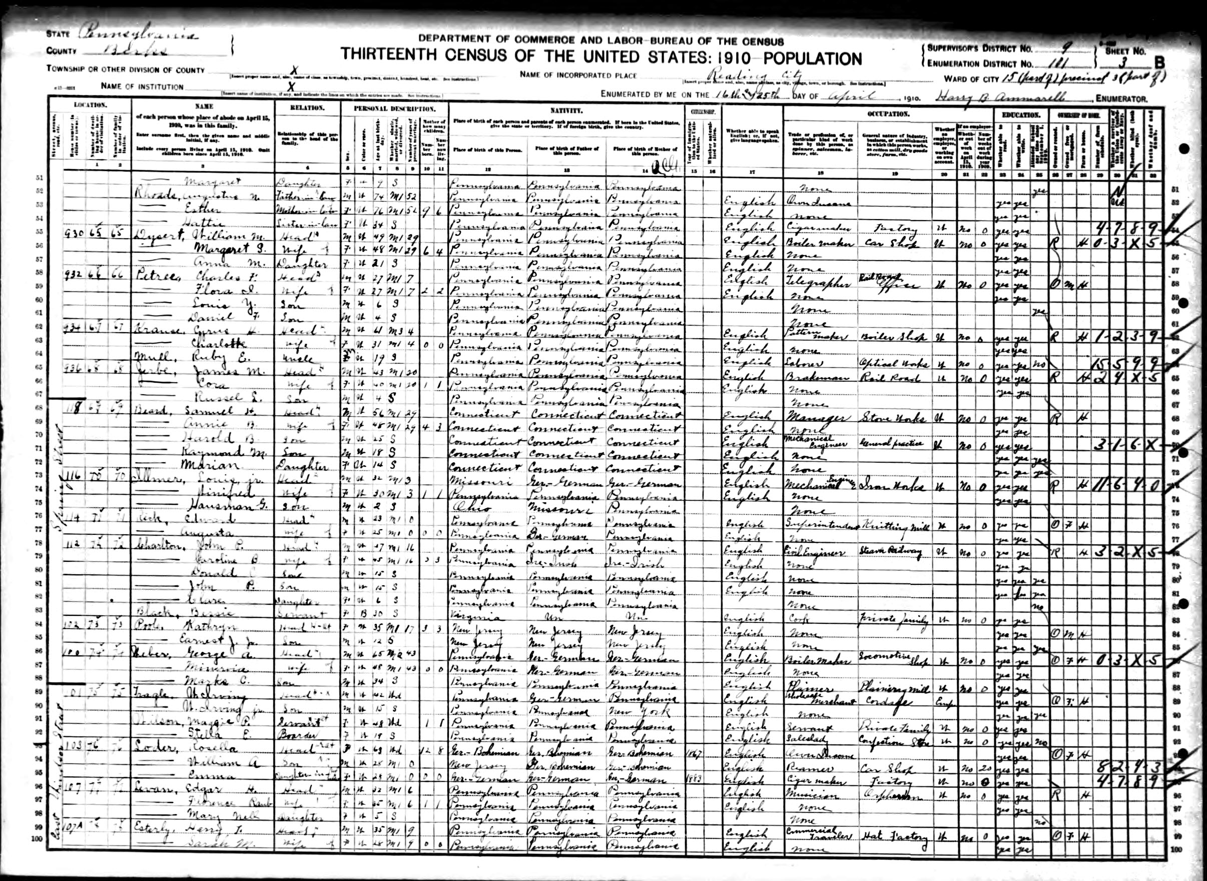 289. “1910 Reading Ward 15, Berks, Pennsylvania; Roll- T624_1315; Page- 3B; Enumeration District- 101; Image- 413,” 16 Apr 1910.