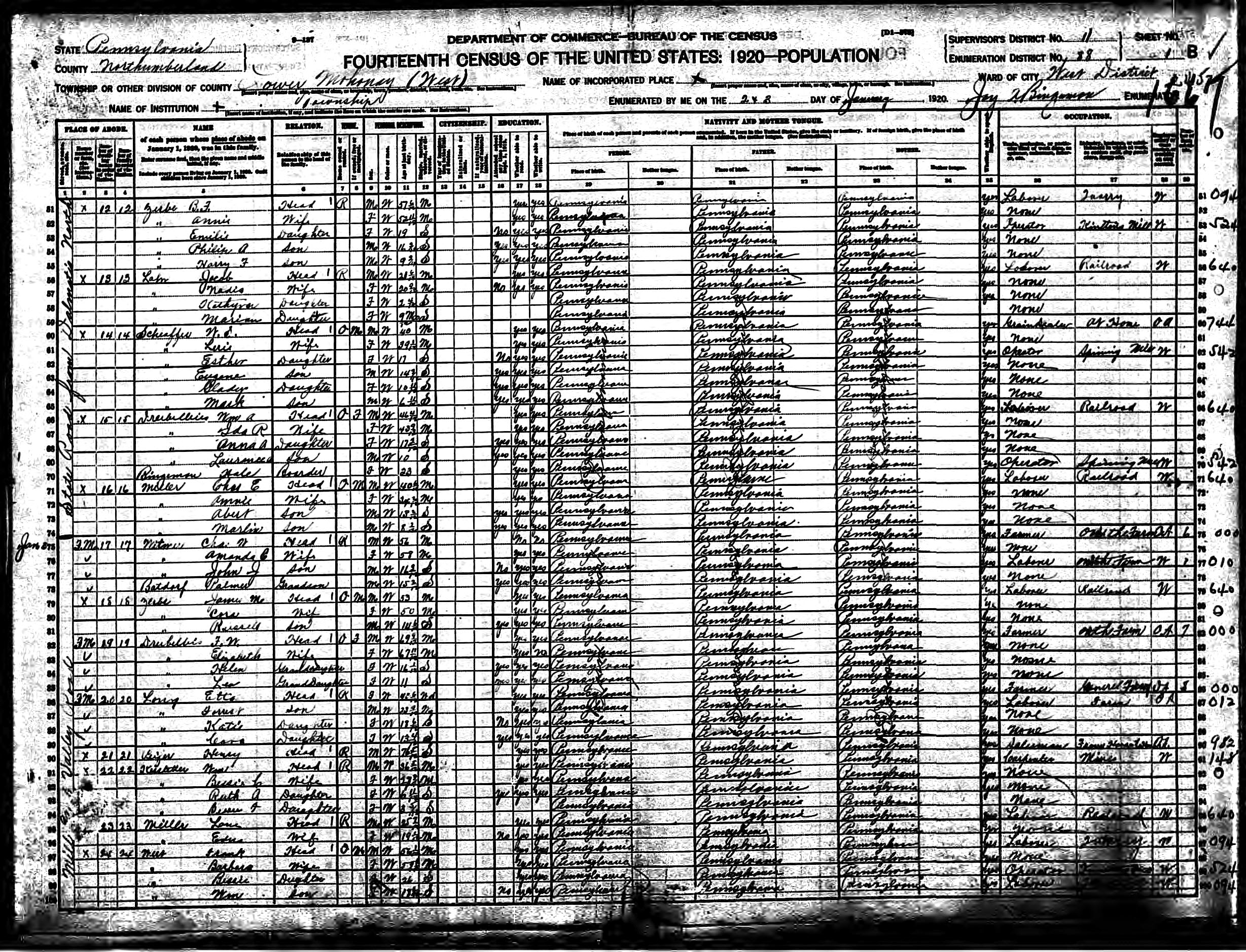 290. “1920 Lower Mahanoy, Northumberland, Pennsylvania; Roll- T625_1611; Page- 1B; Enumeration District- 88; Image- 608,” 24 Jan 1920.