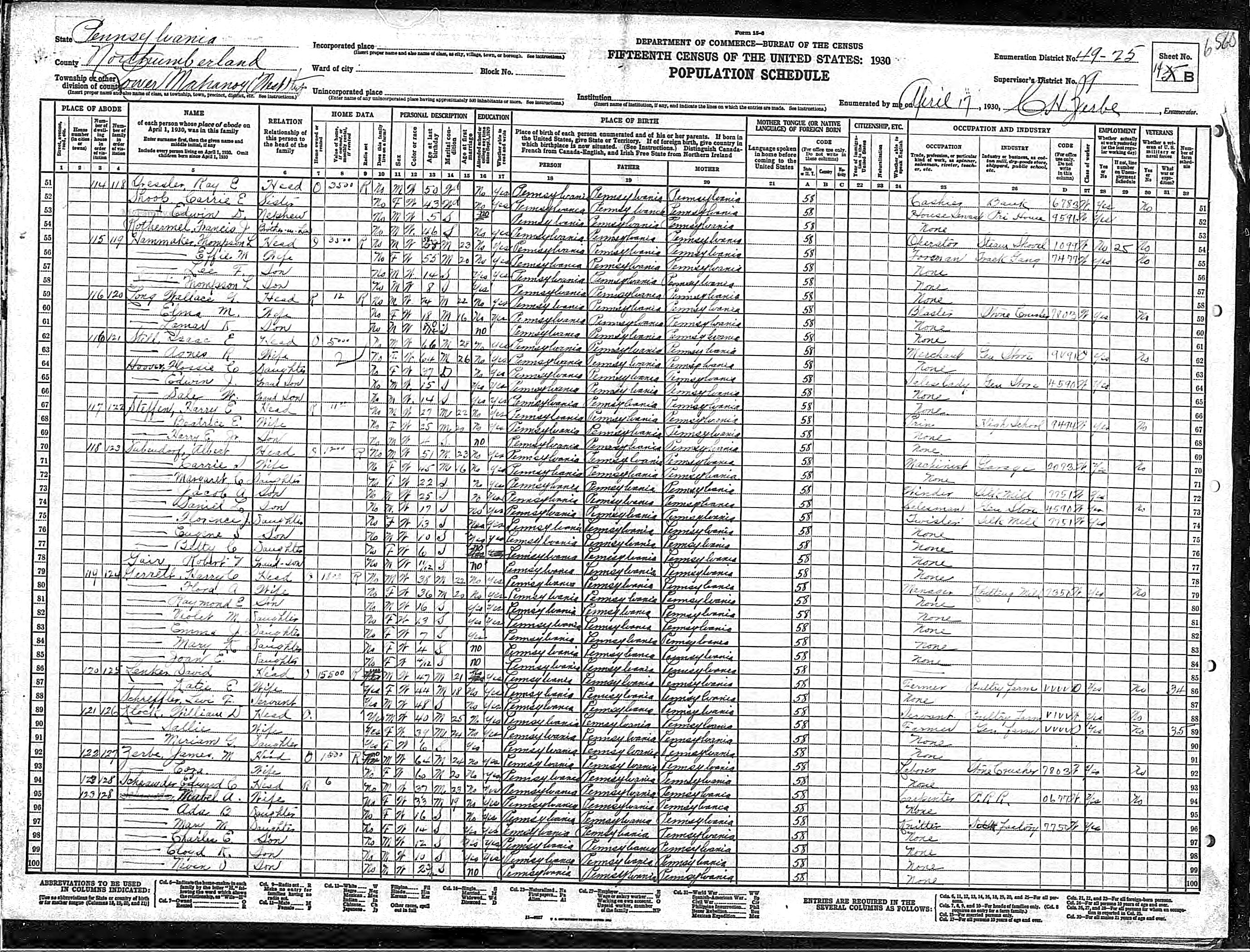 291. “1930 Lower Mahanoy, Northumberland, Pennsylvania; Roll- 2090; Page- 14B; Enumeration District- 25; Image- 204.0,” 17 Apr 1930.