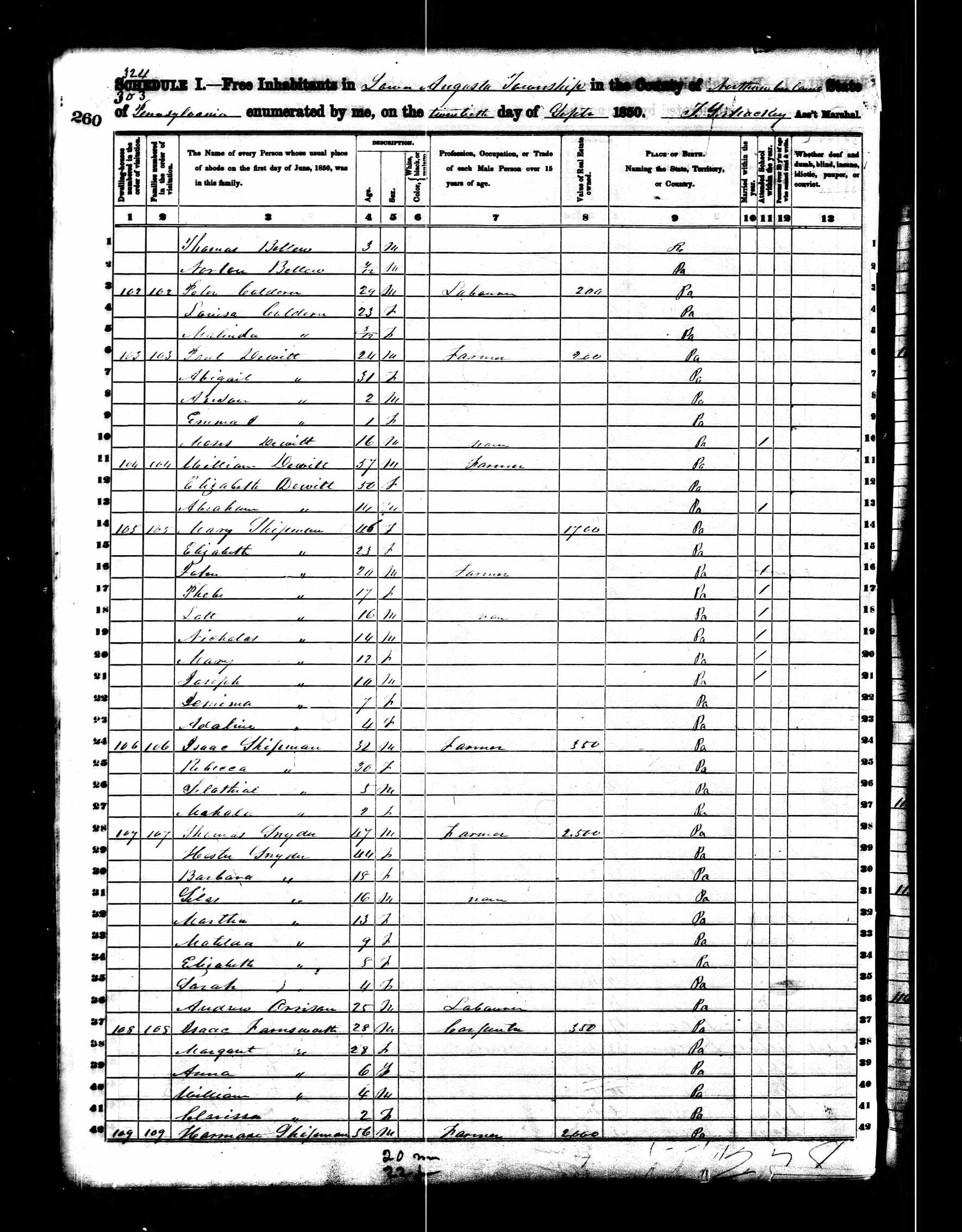 299. “1850 Lower Augusta, Northumberland, Pennsylvania; Roll- M432_804; Page- 121B; Image- 250Des.pdf,” Lower Augusta, Northumberland, Pennsylvania, 20 Sep 1850.