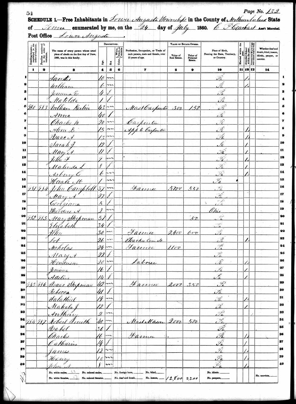 File: 1860 Lower Augusta, Northumberland, Pennsylvania; Roll- M653_1149; Page- 54; Image- 58; Family History Library Film- 805149