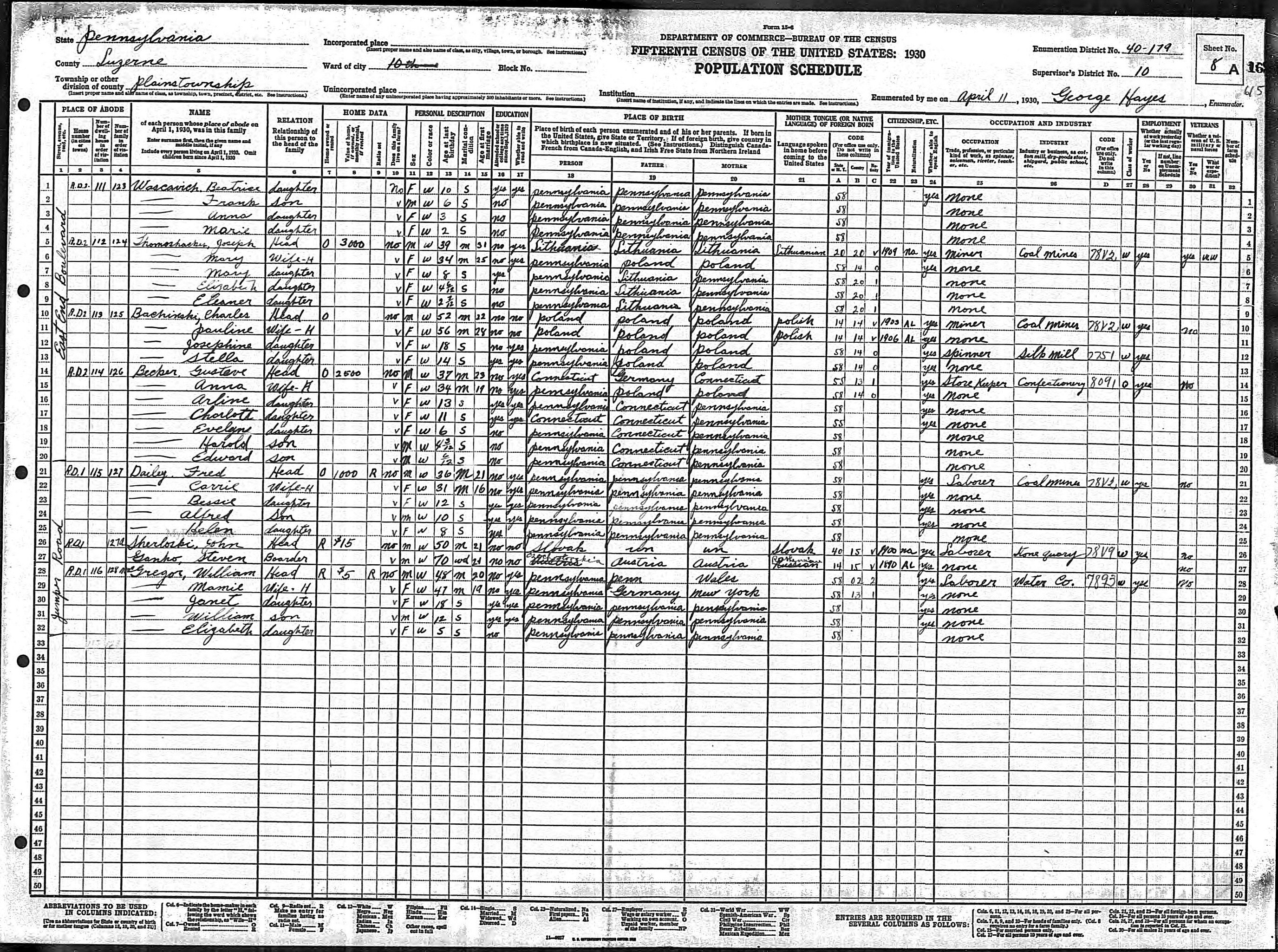 504. “1930 Plains, Luzerne, Pennsylvania; Roll 2071; Page- 8A; Enumeration District- 179; Image- 876.0,” 11 Apr 1930.