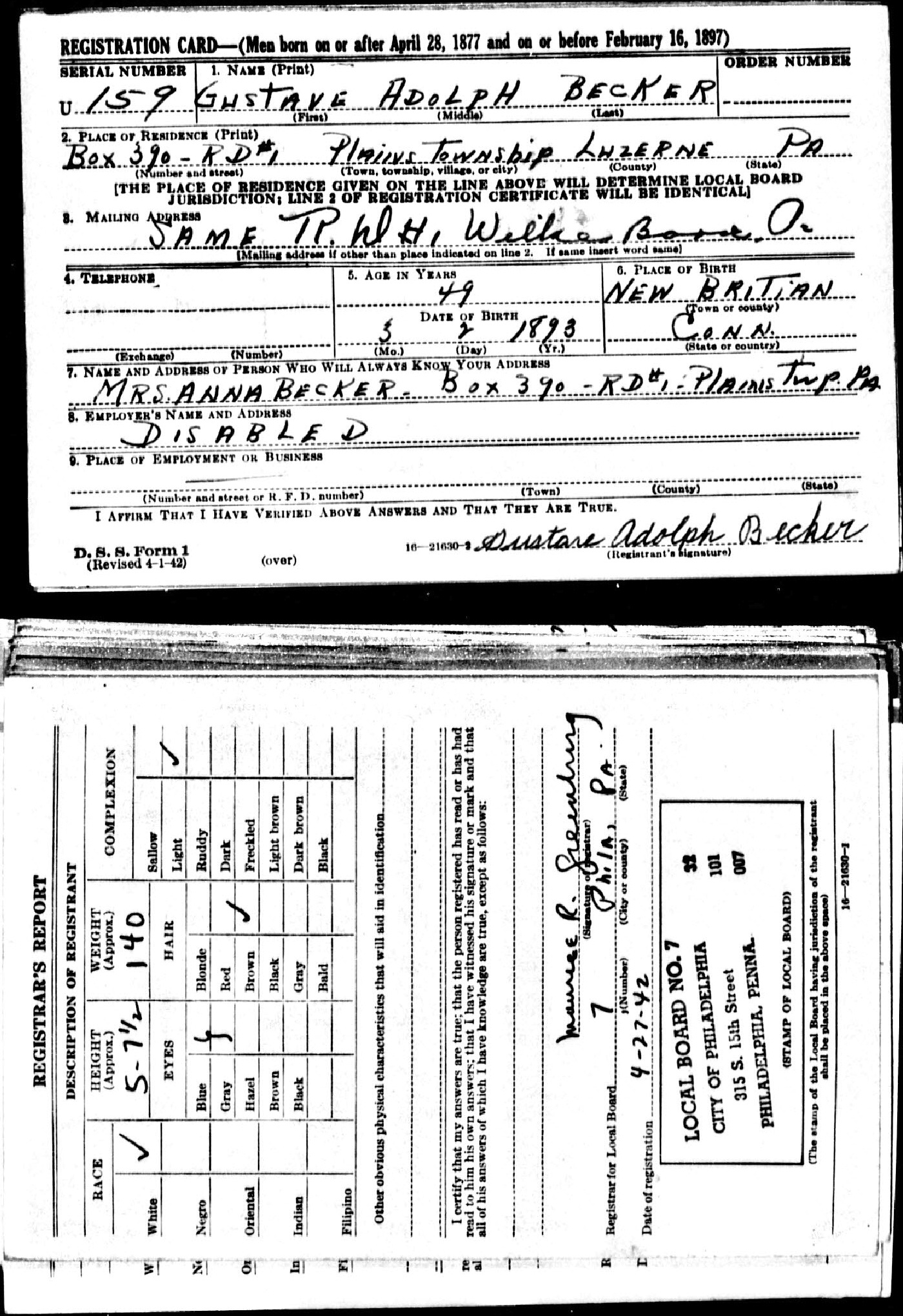 505. “Gustave Adolph Becker U.S. World War II Draft Registration Cards, 1942,” Serial Number: U159, Plains, Luzerne, Pennsylvania.