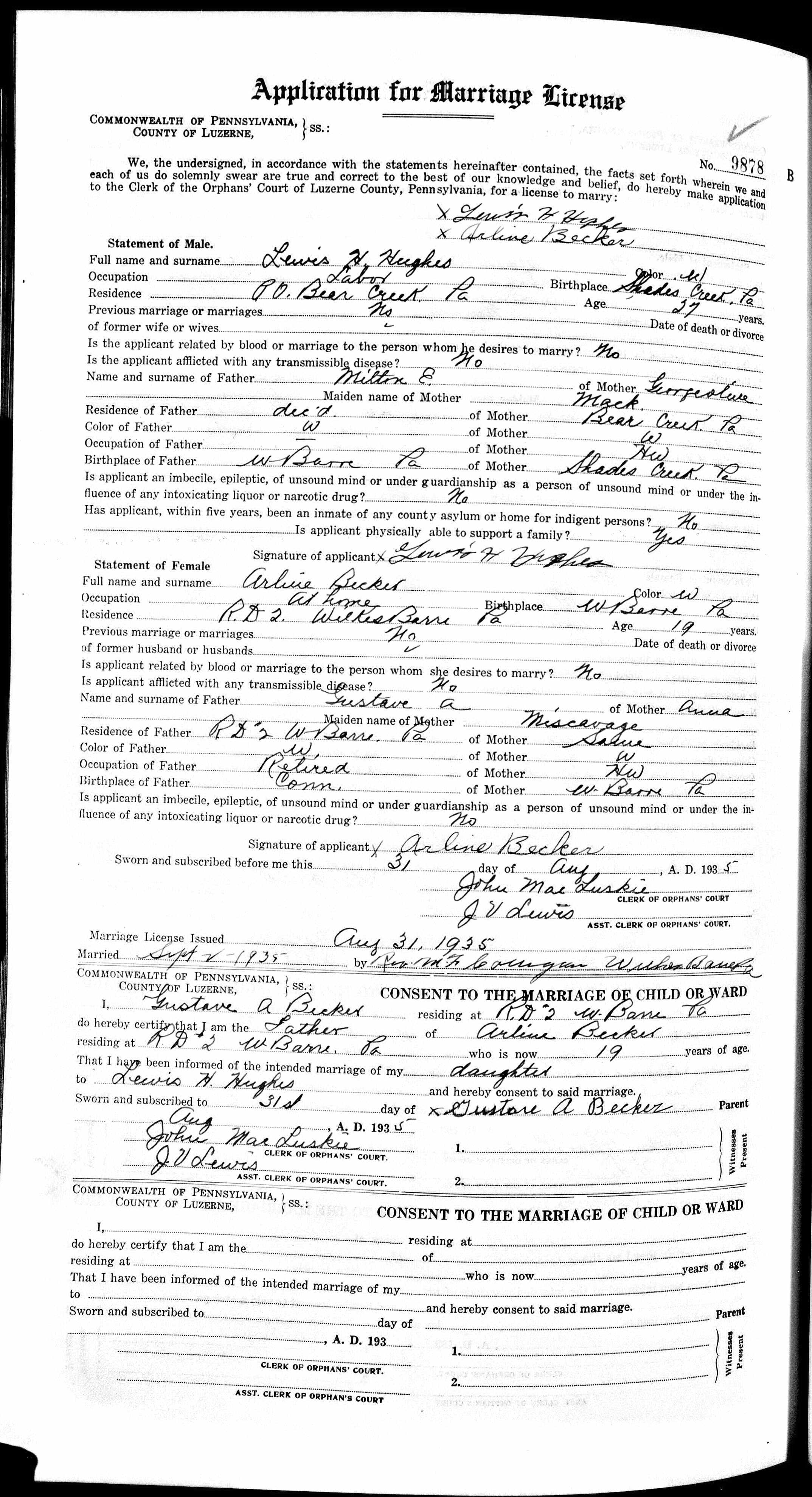 508. “Lewis Hughes and Arline Becker Marriage Application,” 31 Aug 1935, 9878.