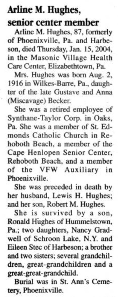509. “Arline Becker Hughes obituary,” Cape Gazette, Lewes, Sussex, Delaware, 23 Jan 2004, 58.
