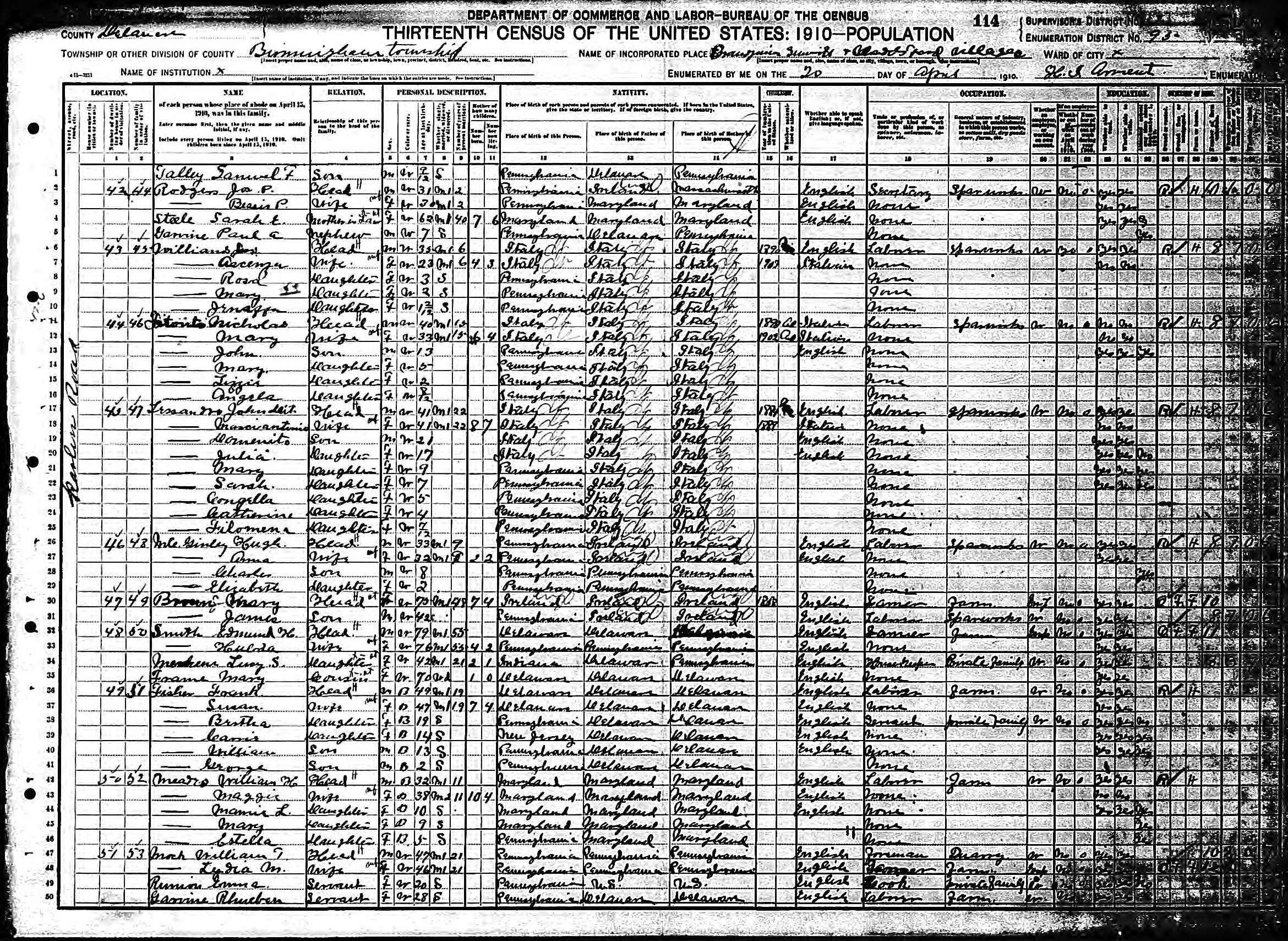 518. “1910 Birmingham, Delaware, Pennsylvania; Roll T624_1338; Page- 3A; Enumeration District- 95; Image- 798Des,” 20 Apr 1910.