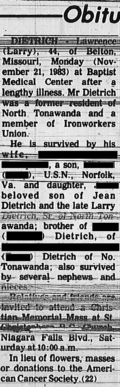 524. “Larry Dietrich obituary,” Tonawanda News, Tonawanda, Erie, New York, 22 Nov 1983, 6.