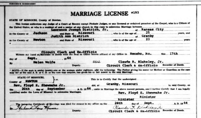 527. “Lawrence and Judith Dietrich Marriage Certificate 1964,” 20 Sep 1964, Granby, Newton, Missouri.