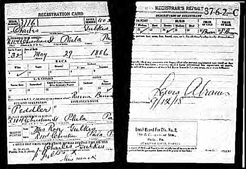 528. “Charles Gulkis World War I Draft Registration Cards, 1917-1918,” 12 Sep 1918, Philadelphia,Philadelphia, Pennsylvania, Roll- 1907527; Draft Board- 2.
