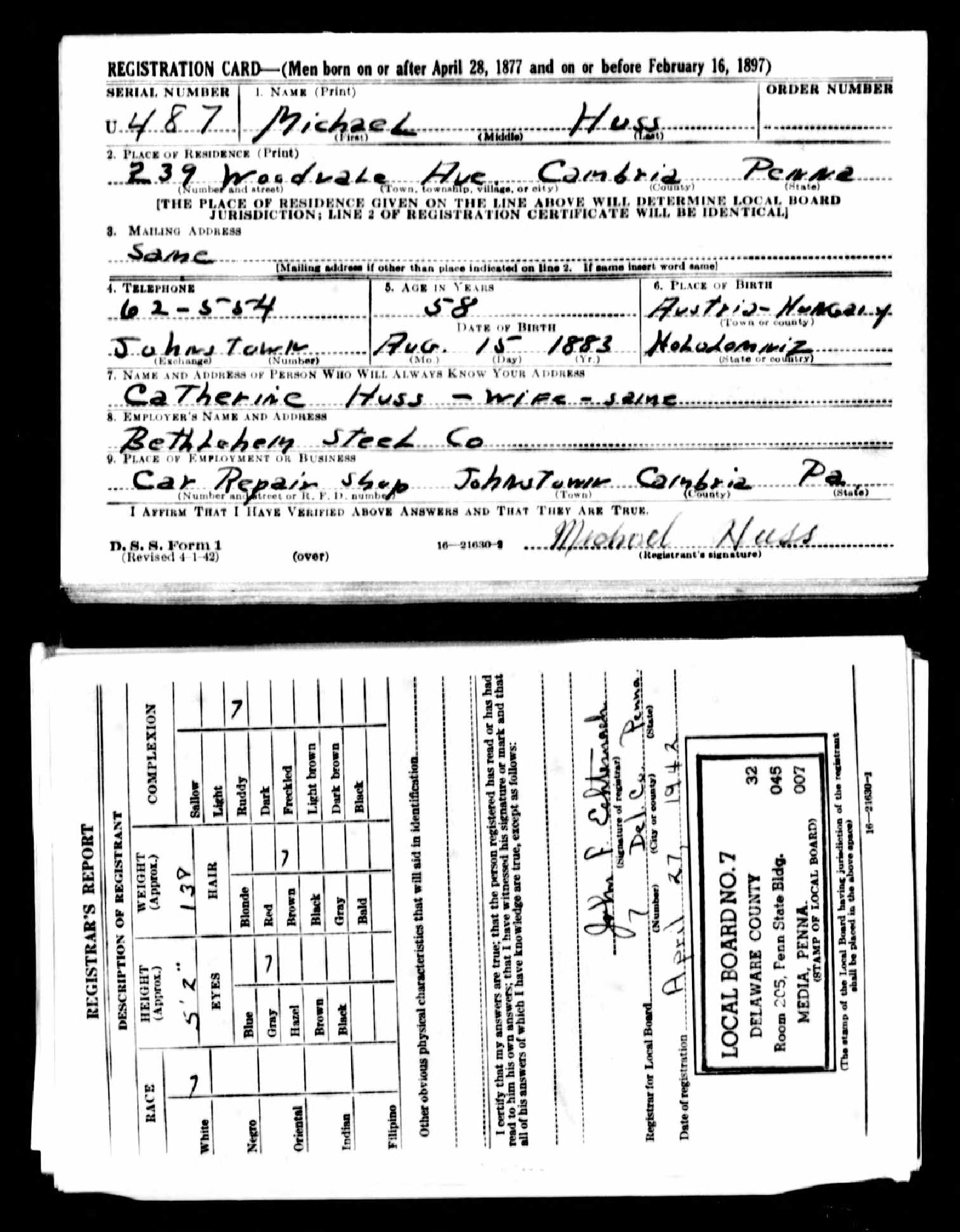 550. “Michael Huss World War II draft card,” 27 Apr 1942, Media, Delaware, Pennsylvania.