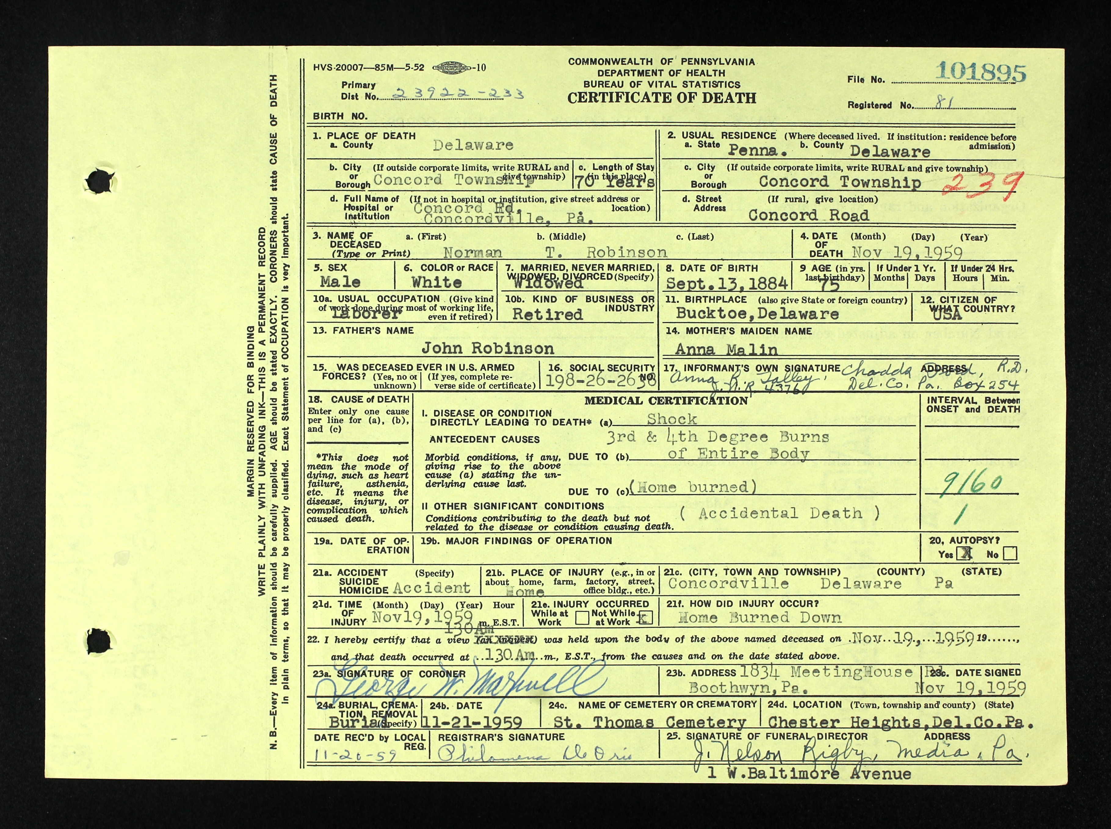 579. “Norman T Robinson Pennsylvania Death Certificates, 1906-1967,” 19 Nov 1959, Concord Township, Delaware, Pennsylvania, 101895, 81.