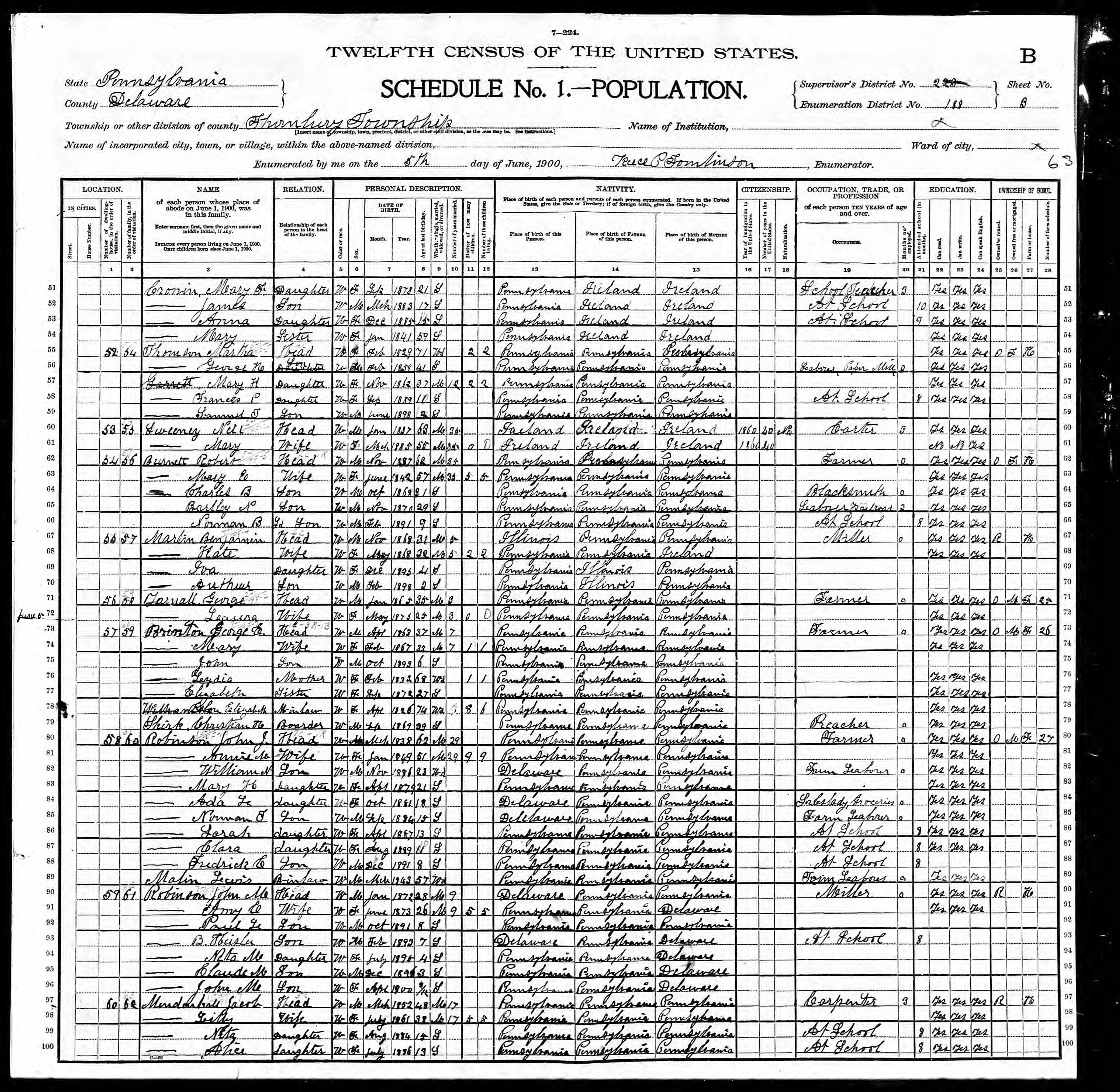 581. “ 1900 Thornbury, Delaware, Pennsylvania; Page: 3; Enumeration District: 0188; FHL microfilm: 1241406,” 5 Jun 1900.