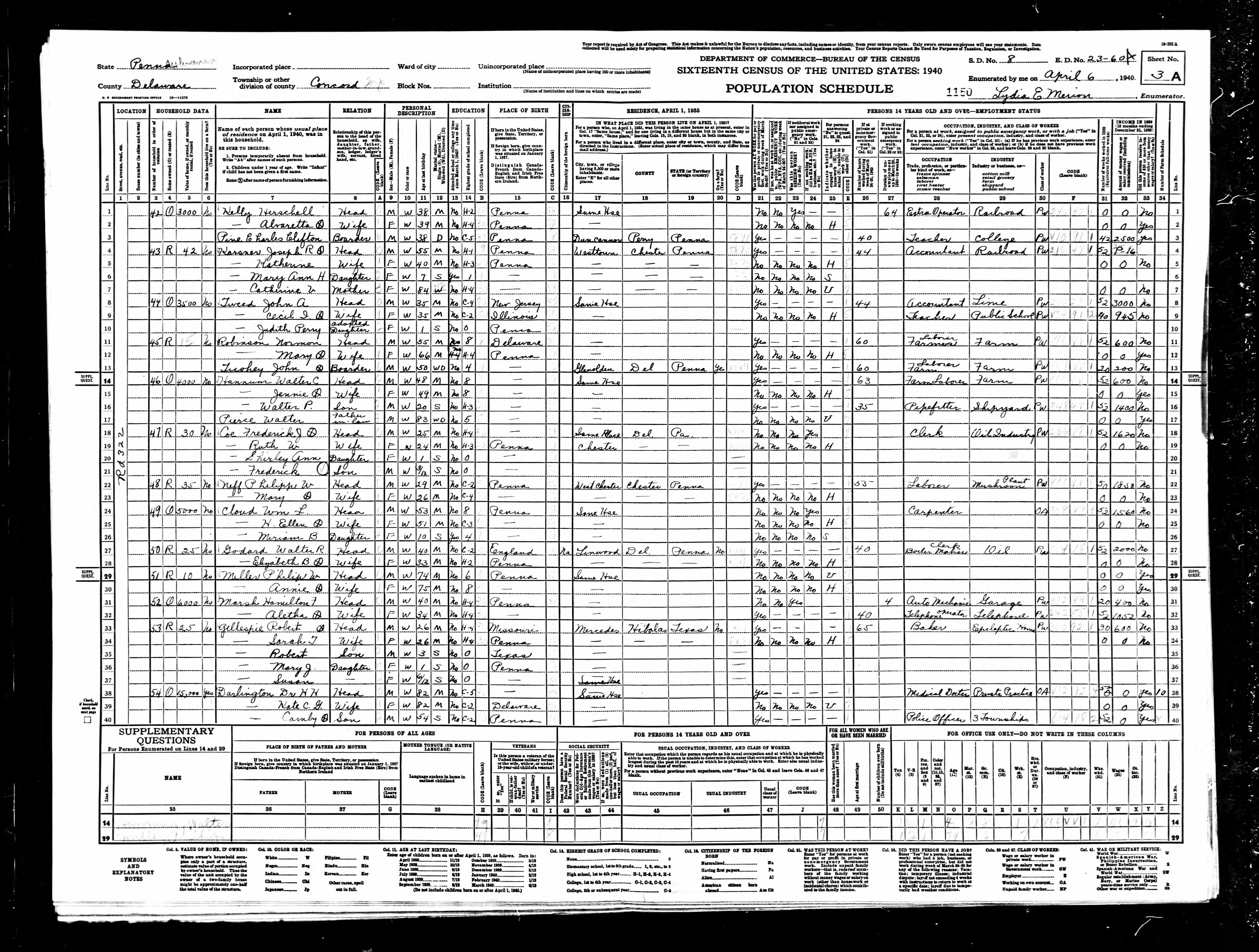 582. “1940 Concord, Delaware, Pennsylvania; Roll: m-t0627-03490; Page: 3A; Enumeration District: 23-60A,” 6 Apr 1940.