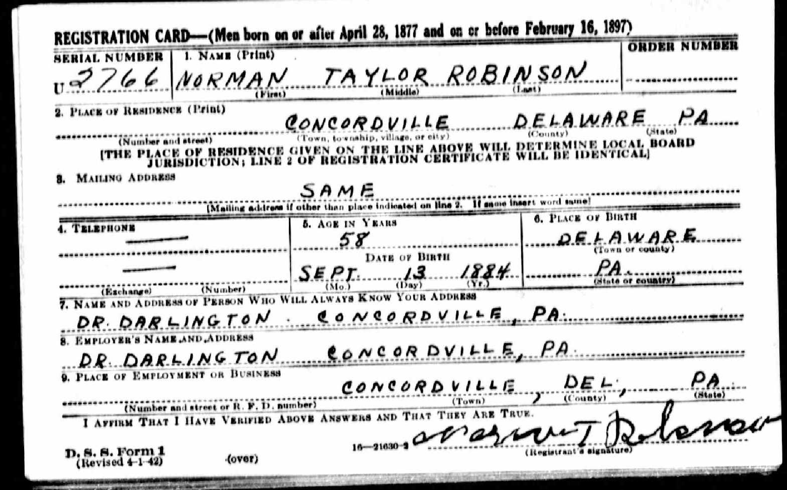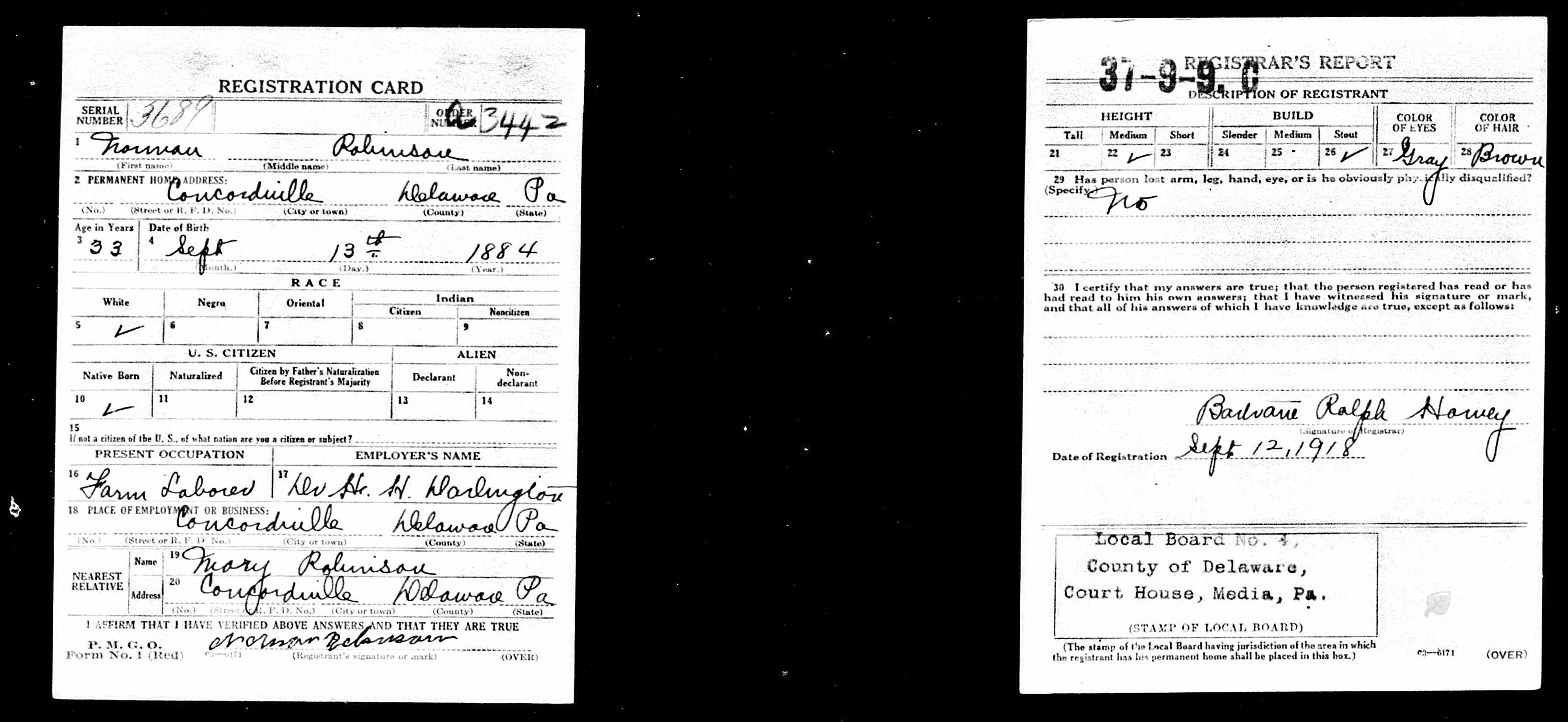 584. “Norman Robinson World War I Draft Registration Cards, 1917-1918,” 12 Sep 1918, Media, Delaware, Pennsylvania.