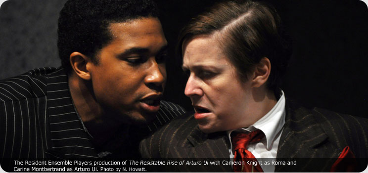 Carine Montbertrand reprises her role as Ui, which she performed so well as a PTTP student 12 years earlier. Heinz-Uwe Haus also returned as director, but the staging was quite different, although he kept the audience participation element substituting balloons for flags. Written in the 1940's as a Hitler parody, it still resonates today as a warning of what could happen again.