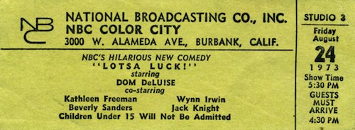 | The only thinkg I enjoyed during a short stay in LA, was Disneyland and seeing these shows being taped. I love seeing how things are made, including this behind the scene experience. Tickets being free, we grabbed what ever we could get including a show called Lotsa Luck, with Dom DeLuise, but three was enough. |