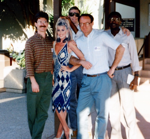 | Guest host Jay Leno with a performance by K.T. Oslin. Photo outside studio with Chip Toner, "Vanna White", Cris Schulthess, me, and Richard Ogwada. |